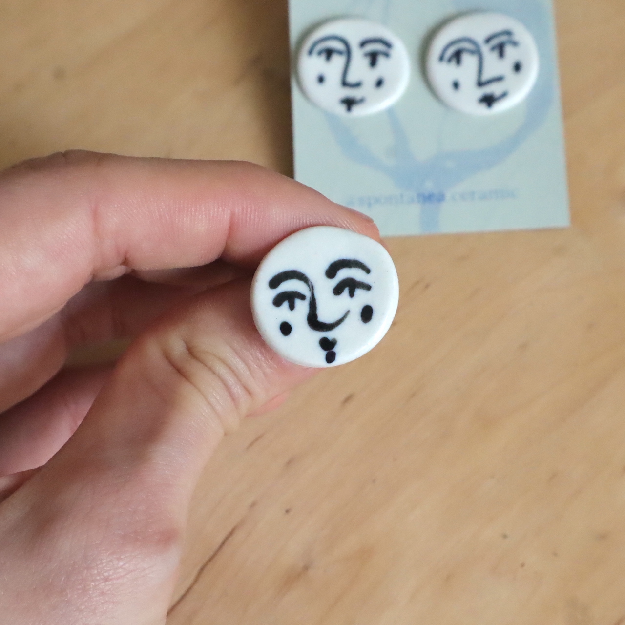Questi orecchini Faccia in ceramica artigianali in gres porcellanato raffigurano un delicato volto di donna sorridente, disegnato interamente a mano su una base bianca. Piccoli nelle dimensioni ma ricchi di personalità, hanno un diametro di 1,5 cm e sono pensati per essere indossati ogni giorno.