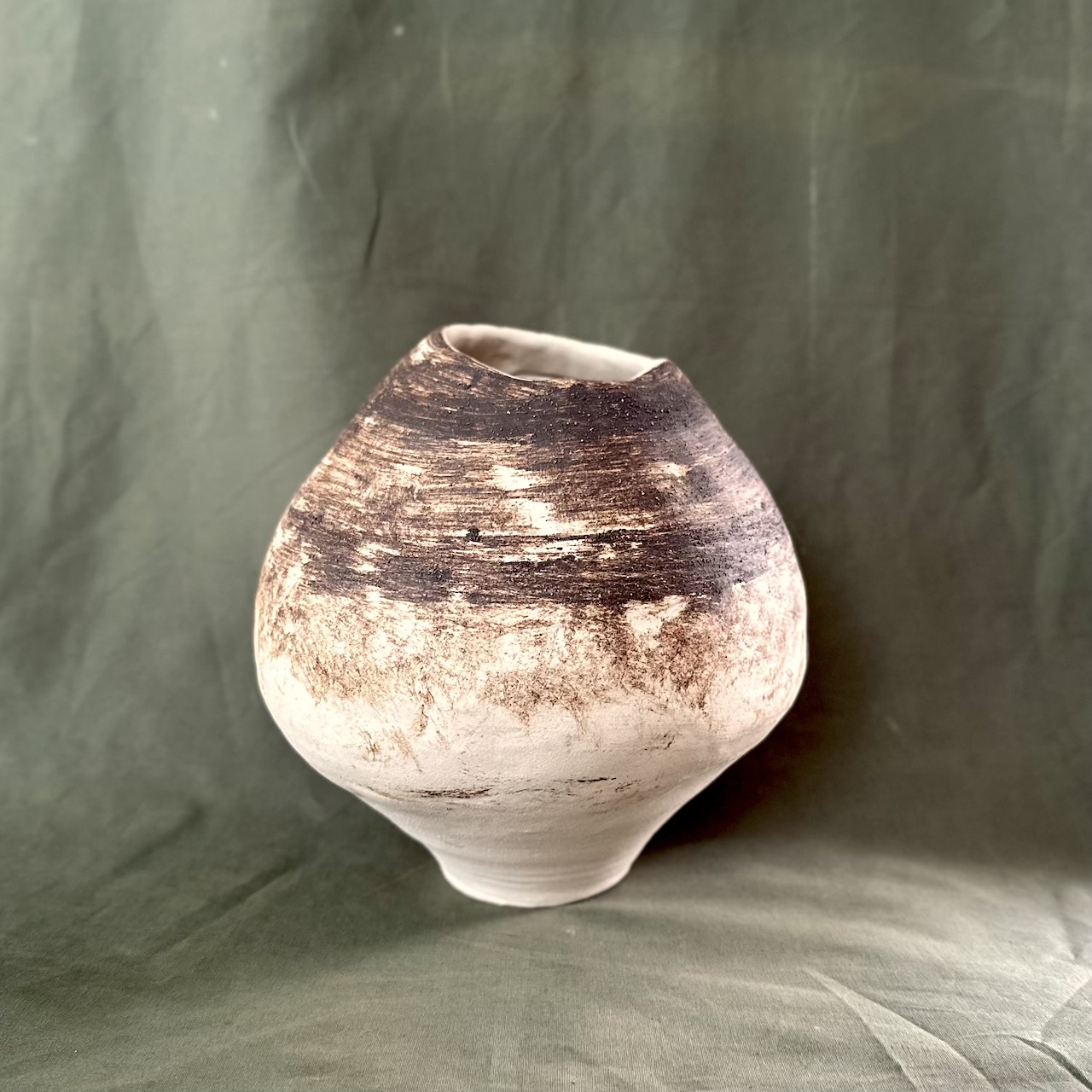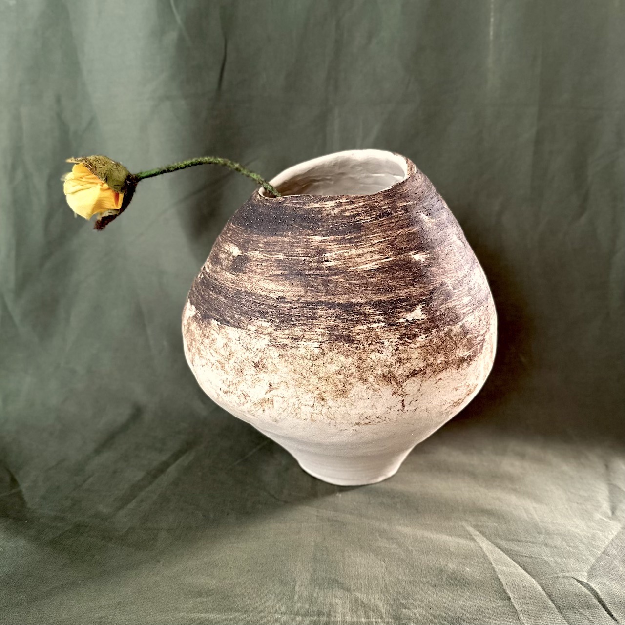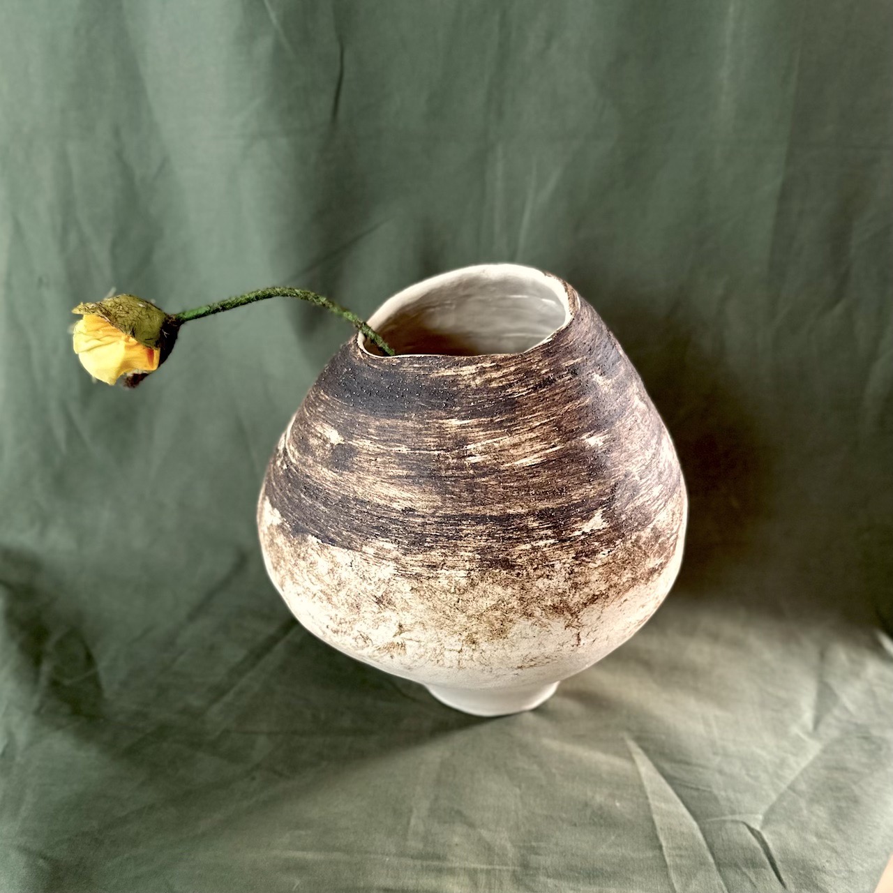 La finitura opaca e l’alternanza cromatica rendono ogni vaso irripetibile, lontano da qualsiasi standard industriale. Il gres, arricchito con fibre di carta (paper clay), garantisce resistenza e stabilità, mantenendo al tempo stesso un aspetto caldo e autentico.